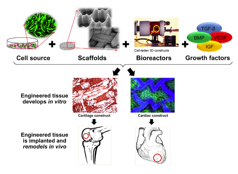 🧪 Fig: Strategy for engineering functional tissues in vitro—combining cells, scaffolds, bioreactors, and growth factors to create viable constructs for therapy [1].