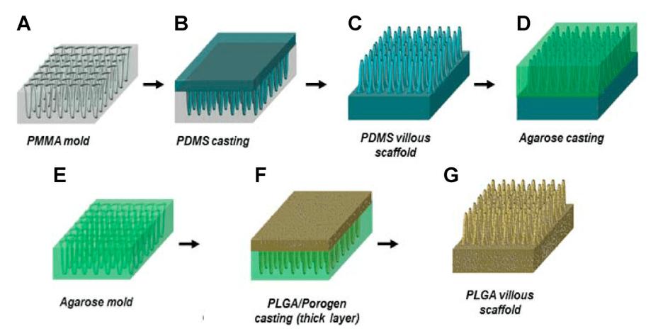 The scaffold was made from poly (glycerol sebacate) (PGS). A PMMA template containing villi depressions of 500 um was created by laser ablation and a PDMS mold replicating the villus impressions was created. An agarose replica mold was created by using 3% agarose over the PDMS mold to form a hydrogen replica. This acts as a sacrificial material thereby eliminating the need for applying stress or force during removal of mold and provide a physiologically mild environment for subsequent cell culture.